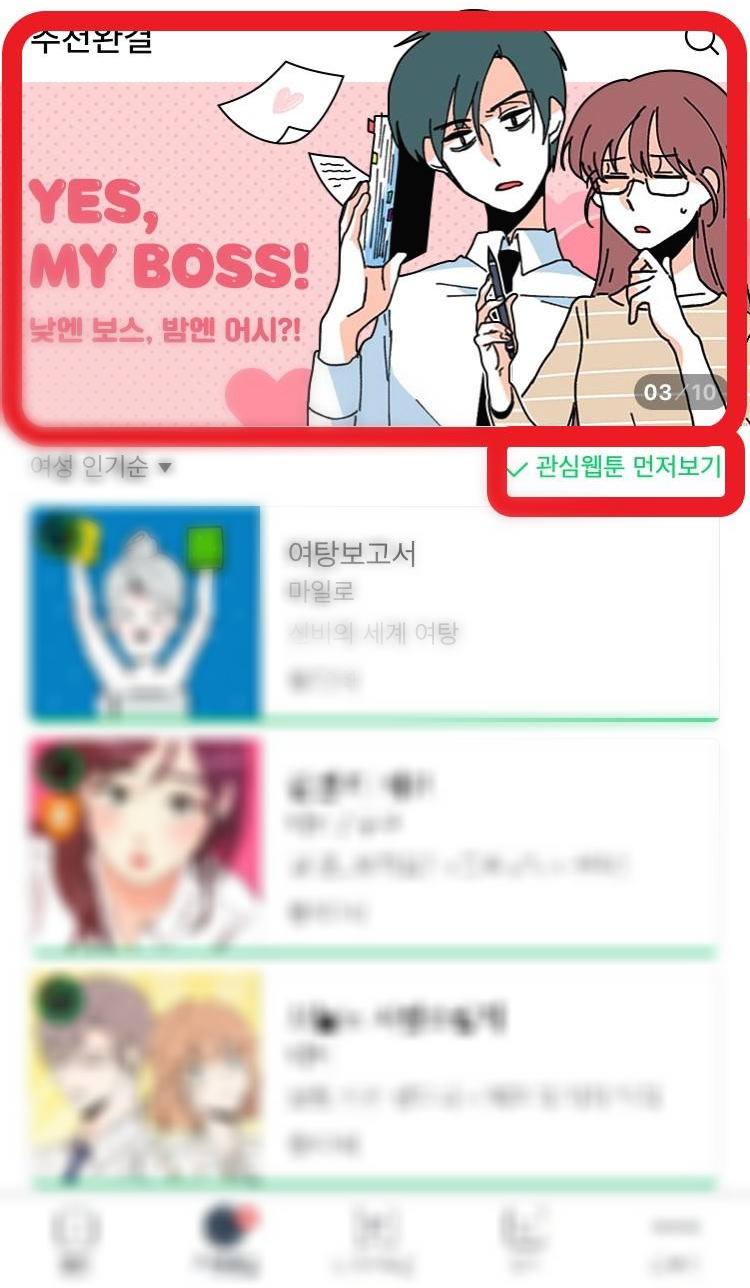또 추천완결 최상단에 나오는 것은 최근에 무료로 풀린 추천완결이에요. 개인적으로 오 주예수여 풀렸으면 좋겠어요. 그리고 바로 아래 관심웹툰 먼저보기를 눌러 본인이 선택한 관심웹툰을 먼저 볼 수 있어요. 그 전에는 인기 순으로 나열되어있죠. 본인이 선택한 관심웹툰과 인기순 1,2,3위가 모두 같다면 왠지 인싸된 느낌을 느낄 수 있어요.