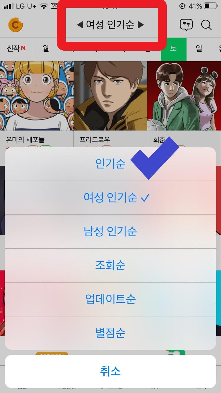 가장 최근에 업데이트된 소식인데요. 처음 화면에서 조금만 내리면 인기순이라는 목록이 생겼습니다. 이걸 누르면 인기순, 여성, 남성 인기순 등으로 웹툰 순서를 바꿀 수 있습니다.