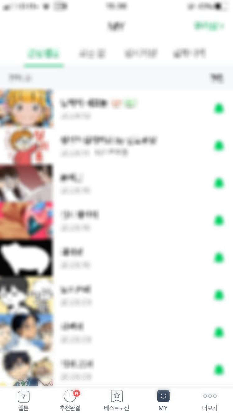하단 바에서 4번째로 확인할 수 있는 MY에서는 내가 웹툰에서 했던 기능들을 확인할 수 있어요. 관심웹툰, 최근 본, 임시 저장, 결재내역으로 구분되어 있는데요.