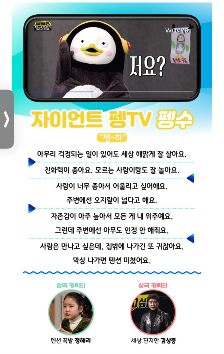 요즘 EBS를 확인하면 꼭 나오는 펭수네요! 펭수는 ESFJ느낌이 강한 것 같아요! 사교성이 넘치는 유형이죠!