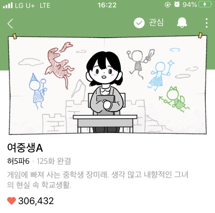 안녕하세요 우연이 왔어요! 여중생 A는 '아이들은 즐겁다'와 현재 '오라존미'를 연재하고 있는 허5파6 작가님의 작품입니다. 허5파6이라는 뜻은 자동가입방지 코드가 허5파6이었다고 하네요. 저는 아이들은 즐겁다, 와 오라존미를 모두 읽었을 만큼 허5파6 작가님의 작품을 좋아합니다. 담담한 묘사, 심리묘사의 세세함 등에 매력에 빠져 읽었던 것으로 기억합니다. 현재 무료로 다시 연재하는 시점에서 여중생A를 다시 정주행하고 있네요.