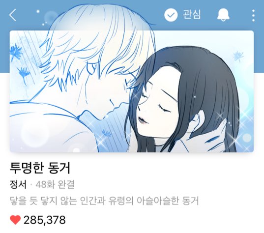 안녕하세요? 우연이 왔어요! 오늘은 네이버 추천 완결 웹툰 중 하나 투명한 동거를 가지고 왔습니다. 닿을 듯 말 듯한 두 사람의 거리를 잘 표현한 웹툰이라고 생각되는데요. 정말 그 거리가 닿지 않는 거리이고 그 거리가 심리적인 거리감을 만들어냅니다. 보통 우리가 생각하는 유령과는 다른 특징을 짚어낸 부분이 놀라웠습니다. 스포일러가 있으니 작품을 아직 못 보신 분들은 웹툰을 보고 나서 읽는 것을 추천합니다.