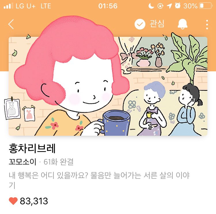 그렇다면 작가님이 말하는 '행복'이라는 것은 무엇일까요. 그들이 하는 행동들과 생각들, 그리고 그들의 이야기를 따라가다 보면 독자 스스로 해답을 찾아 냈을지도 모릅니다. 잠시 인물들처럼 방황을 하거나 삶에 대해 질문을 던질 때 읽으면 좋은 웹툰입니다. 따듯한 차 또는 커피 한 잔을 마시면서 보면 더 좋겠네요. 차 또는 커피가 아니면 웹툰에서 나오는 인물들이 우리들의 마음을 따듯하게 녹여줄지도 모르니까요.