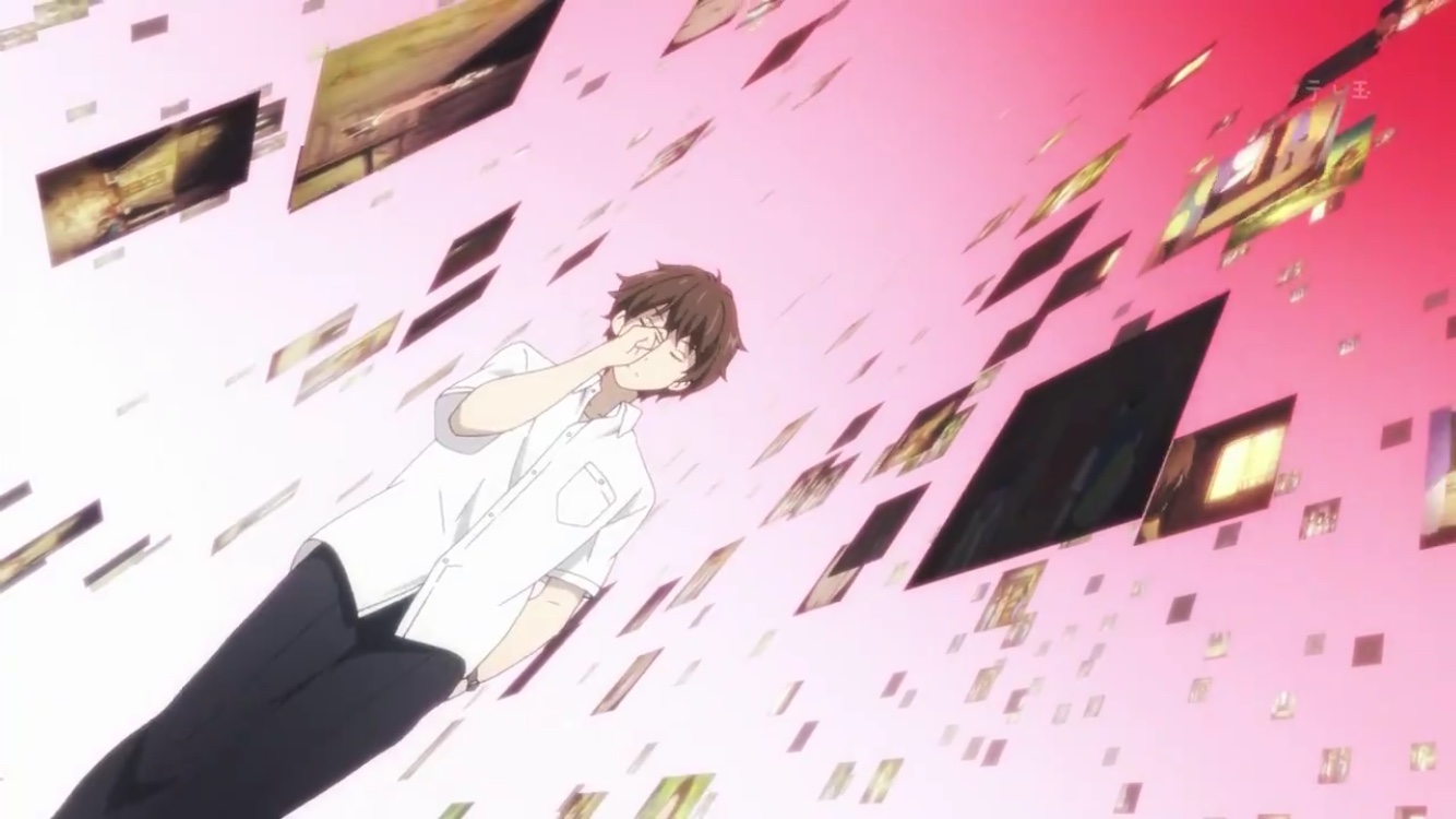 애니메이션 빙과에서는 주인공 호타로를 돋보이기 위해 여러 연출을 보여주는데요. 예를 들어 호타로가 머리를 쥐어 뜯고(?) 추리를 할 때면 여러 연출들을 보여줍니다.